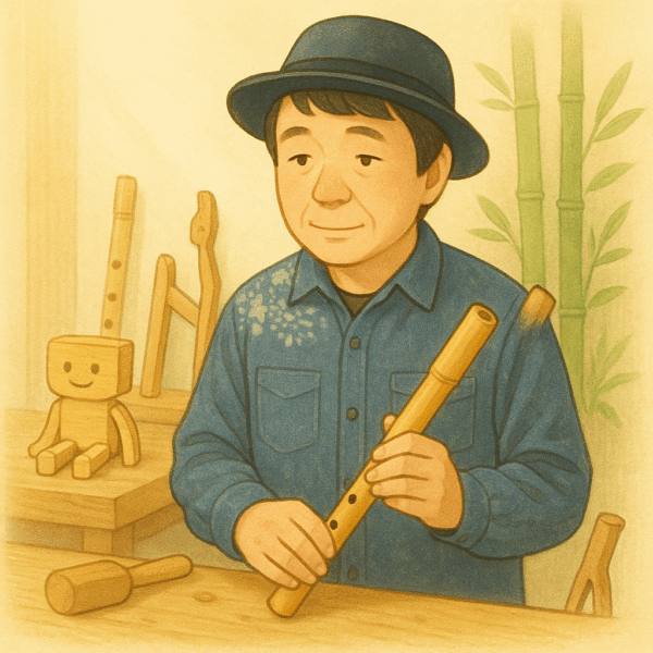 音との出会いは南米アンデスの笛「ケーナ」。サンポーニャや竹笛の演奏・指導を通じて、これまで延べ2万人以上に“音を通じた出会い”を届けてきた。2002年には木の人形楽器「リンバージャック」と出会い、以後、木と竹の楽器を通して「つくる・鳴らす・つながる」をテーマに、学校・児童館・特別支援・放課後デイ・高齢者施設・病院・地域イベントなど、世代や立場をこえて“音と手の学び”を届けている。